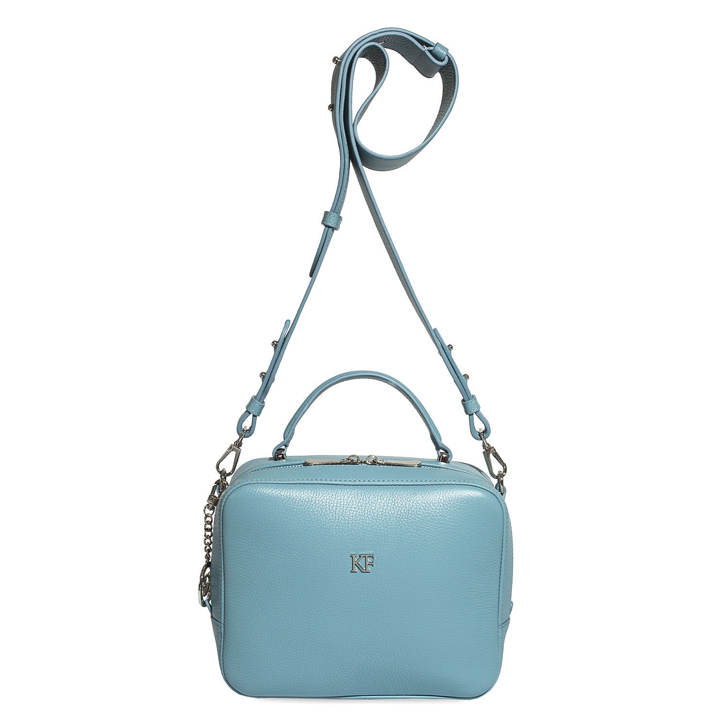 Blue genuine leather woman shoulder bag from Ukrainian designer Katerina Fox. Fashionable and elegant modern bag KF for bright girls and women. This bag is able to attract attention and highlight your exquisite taste. The internal space of a bag is equipped with one spacious compartment and one zipper pocket. The bag is closed with a zipper. The length of the strap is adjustable. The kit also includes a storage bag.