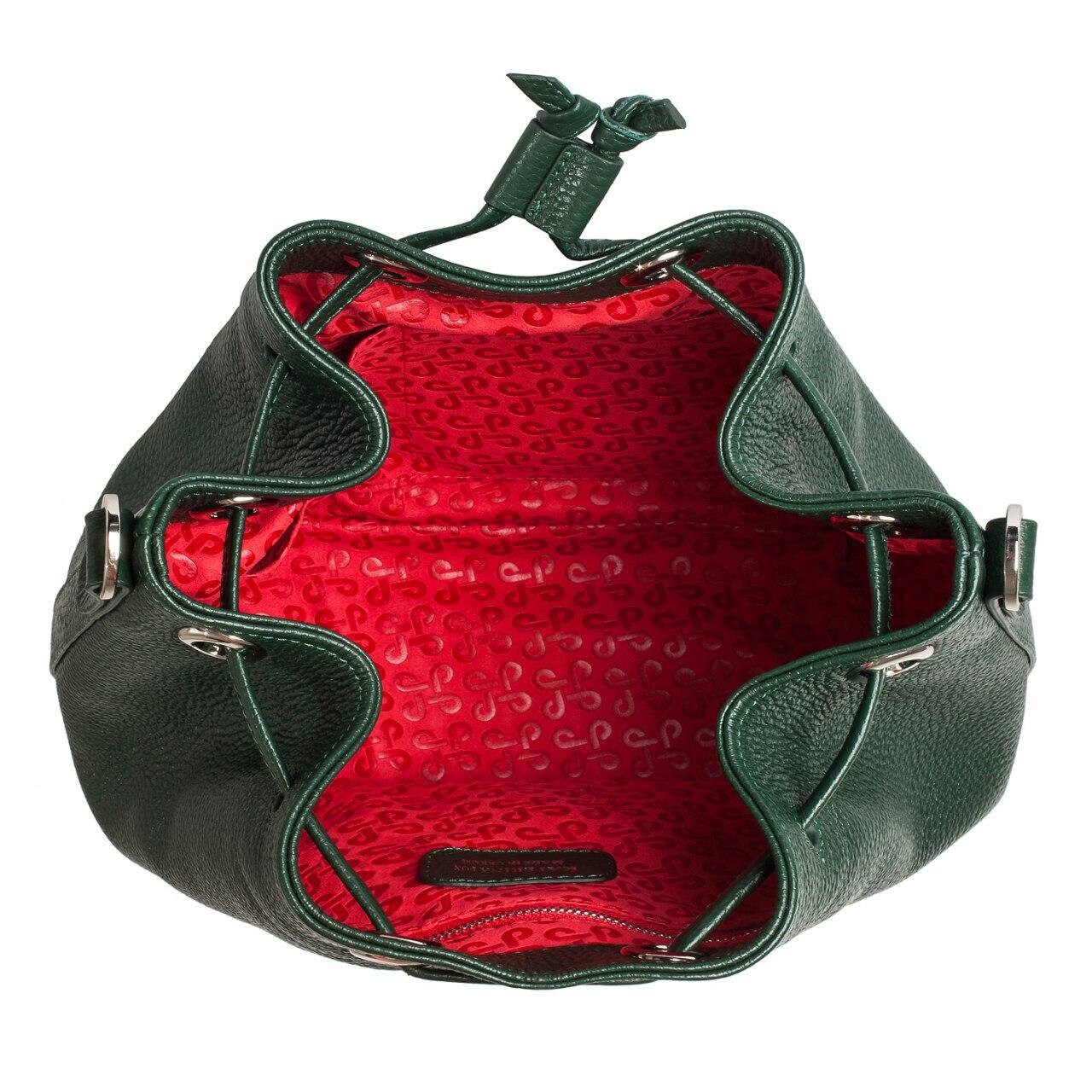 Dark Green genuine leather handbag from ukrainian designer Katerina Fox. The advantages of this model is stylish design and excellent leather, from which it is made. All accessories for Katerina Fox bags makes the same factory as for Michael §¬ors, Calvin Klein, DKNY and other famous brands.The internal space of a bag is equipped with one spacious compartment and two patch-pockets and one zipper pocket. The bag is pulled together with a leather lace. The bottom of the bag is protected with metal legs. There is a long handle that allows you to wear the bag on the shoulder. The kit also includes a storage bag.