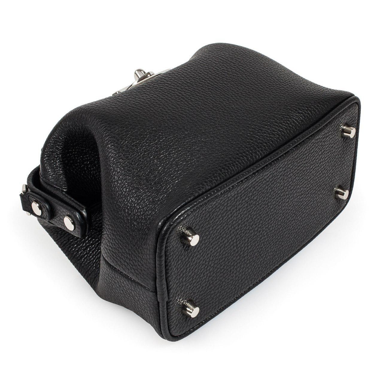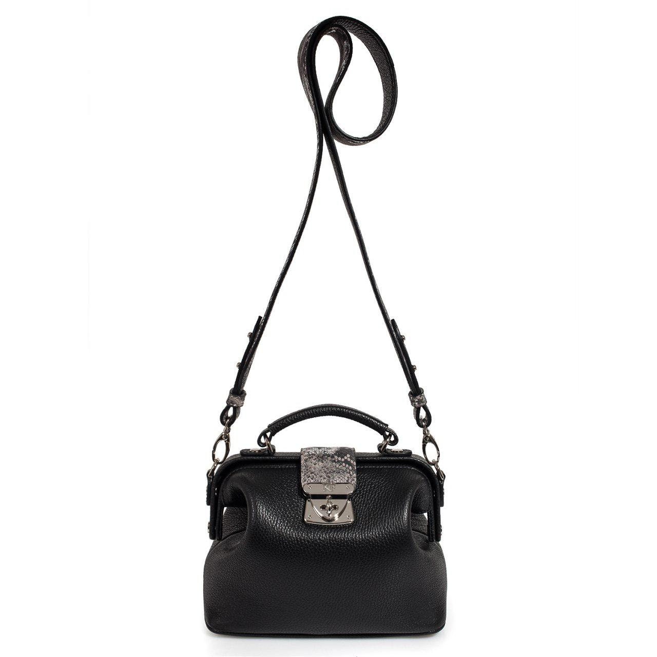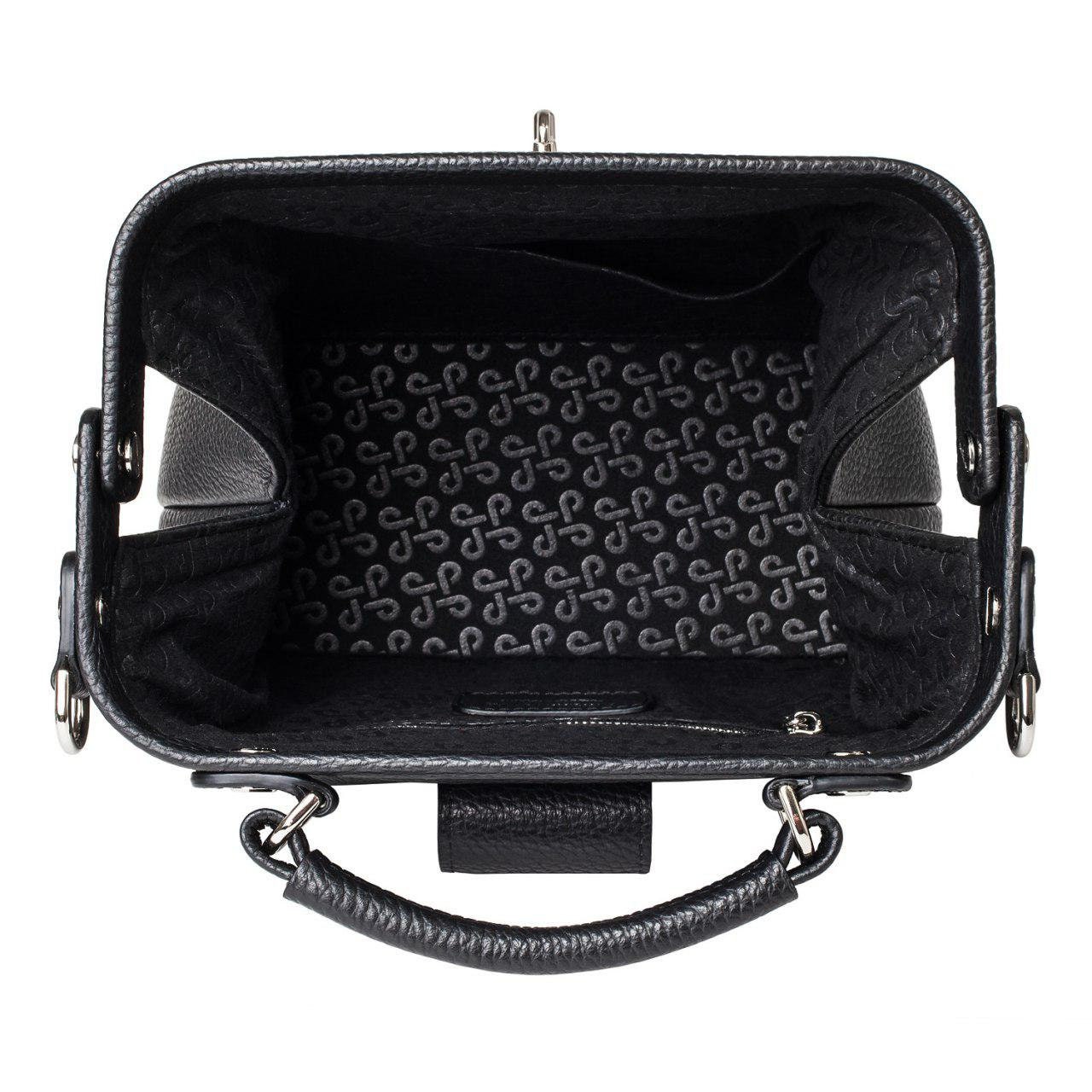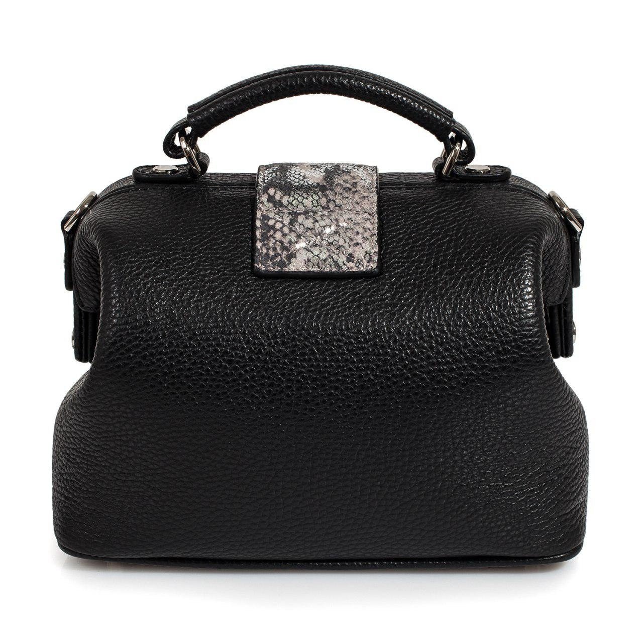 Black genuine leather handbag from ukrainian designer Katerina Fox. This model is designed for women who appreciate the sleek design combined with functionality and comfort. High-quality and reliable hardware ensure long service bags. The internal space of a bag is equipped with one spacious compartment and two patch-pockets and one zipper pocket. The bag is closed with a clasp. The bottom of the bag is protected with metal legs. There is a long handle that allows you to wear the bag on the shoulder. The kit also includes a storage bag.