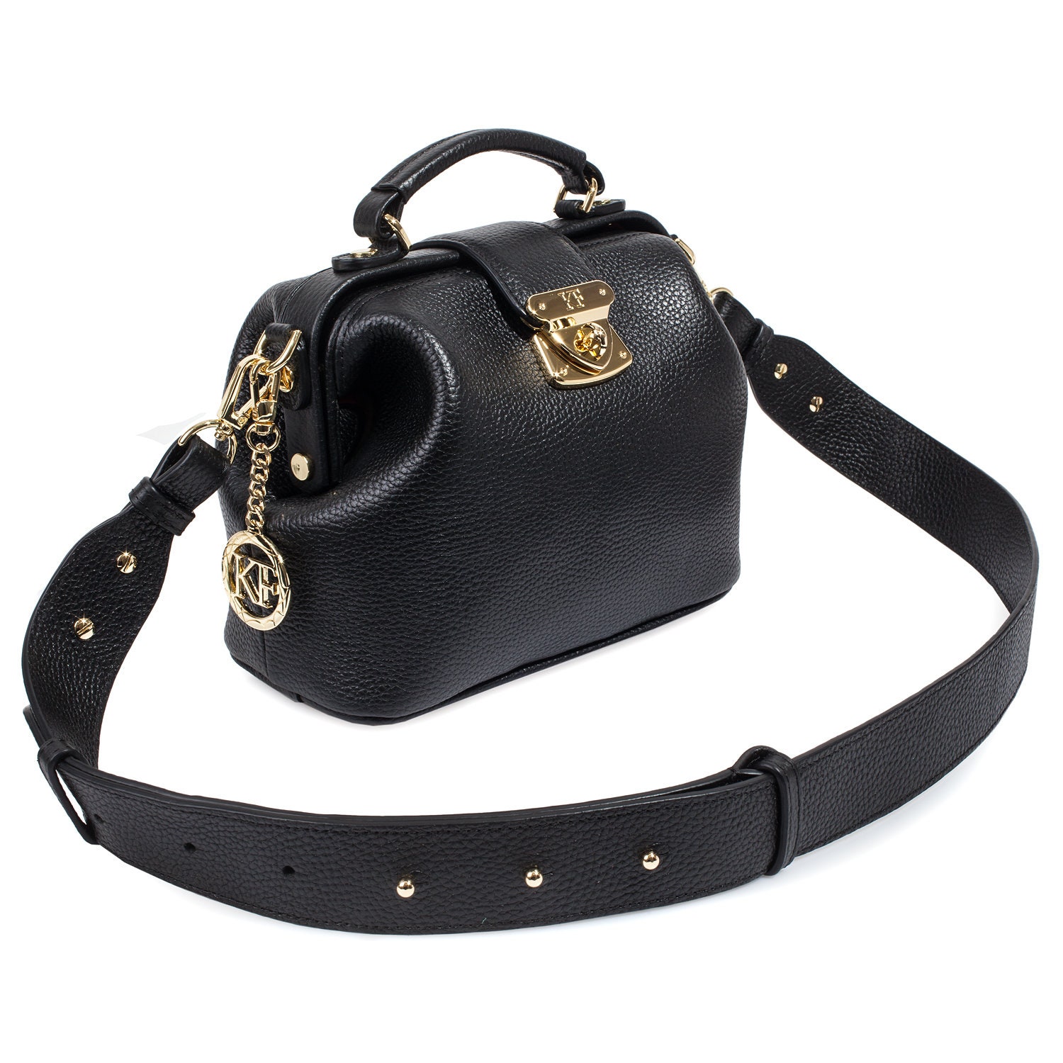 Black genuine leather handbag from ukrainian designer Katerina Fox. This model is designed for women who appreciate the sleek design combined with functionality and comfort. High-quality and reliable hardware ensure long service bags. The internal space of a bag is equipped with one spacious compartment and two patch-pockets and one zipper pocket. The bag is closed with a clasp. The bottom of the bag is protected with metal legs. There is a long handle that allows you to wear the bag on the shoulder. The kit also includes a storage bag.